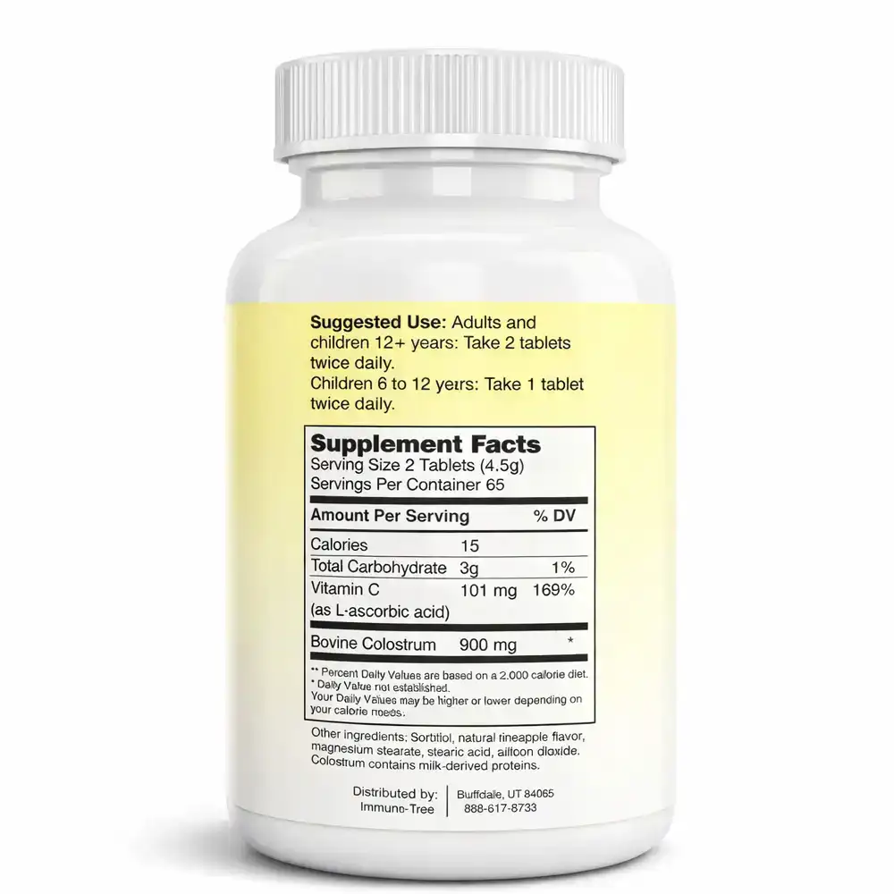 Immune Tree colostrum cold-pressed into a tablet. Taking 2-3 lozenges twice daily provides you with 1,800 mg worth of colostrum. Also an excellent source of vitamin C!
