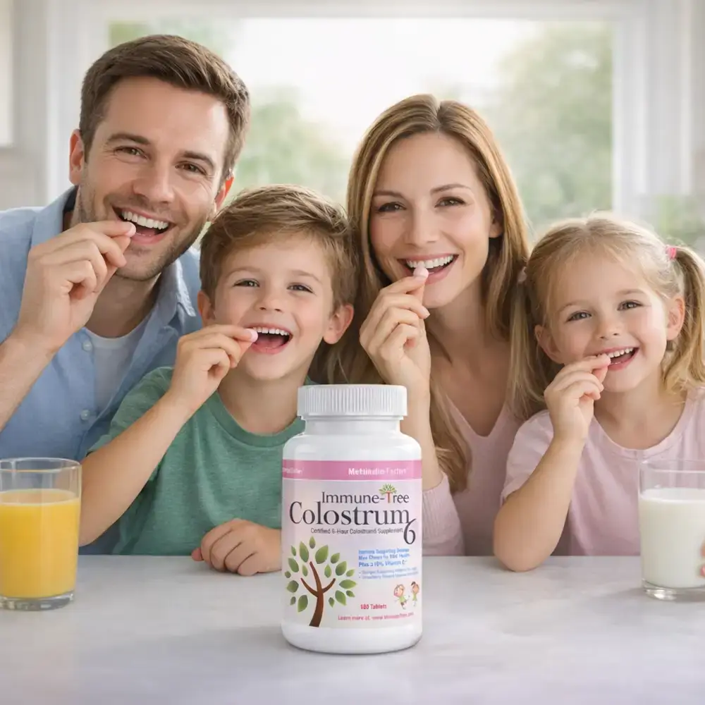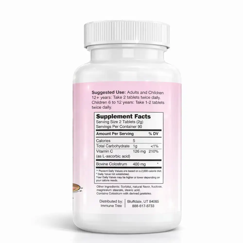 Immune Tree colostrum cold-pressed into a tablet; for kids of all ages! Taking 2-3 tablets twice daily provides you with 1,200 mg worth of colostrum. Also an excellent source of vitamin C!